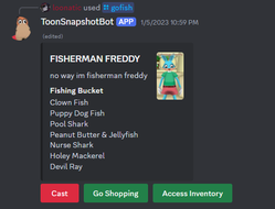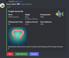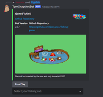 It takes use of the Discord interaction system to simulate the fishing algorithm from Toontown Online. Player data is stored on a database for persistent sessions.